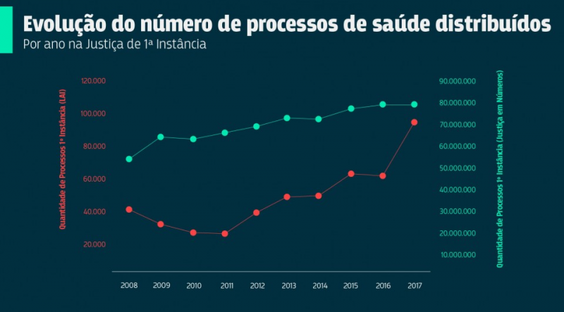 Entre 2008 e 2017, o número de demandas judiciais relativas à saúde registrou um aumento de 130%, conforme revela a pesquisa “