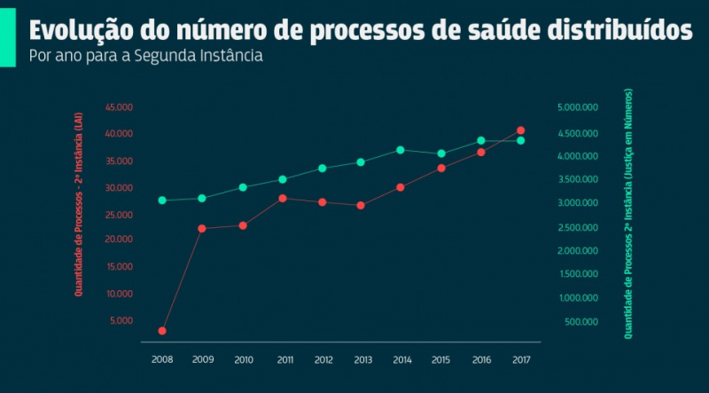 A pesquisa identificou que o setor de saúde foi responsável por 498.715 processos de primeira instância distribuídos em 17 tribunais de justiça estaduais, e 277.411 processos de segunda instância, distribuídos entre 15 tribunais de justiça estaduais. Os números refletem no orçamento do Ministério da Saúde, que registrou um crescimento, em sete anos, de aproximadamente 13 vezes nos gastos com demandas judiciais, alcançando R$ 1,6 bilhão em 2016. "Utilizamos uma variedade de dados de gestão processual, no período de 2008 a 2017, registrando o aumento da judicialização do período em 130%. Verificamos também que apenas um pequeno número de decisões citam os órgãos que qualificariam as decisões, como os NATs e o Conitec. Esse resultado reforça a atuação do CNJ na consolidação e organização dos NATs em uma plataforma e fortalecê-los, como tem sido feito com o e-NAT Jus", afirmou o professor Paulo Furquim durante apresentação da pesquisa.