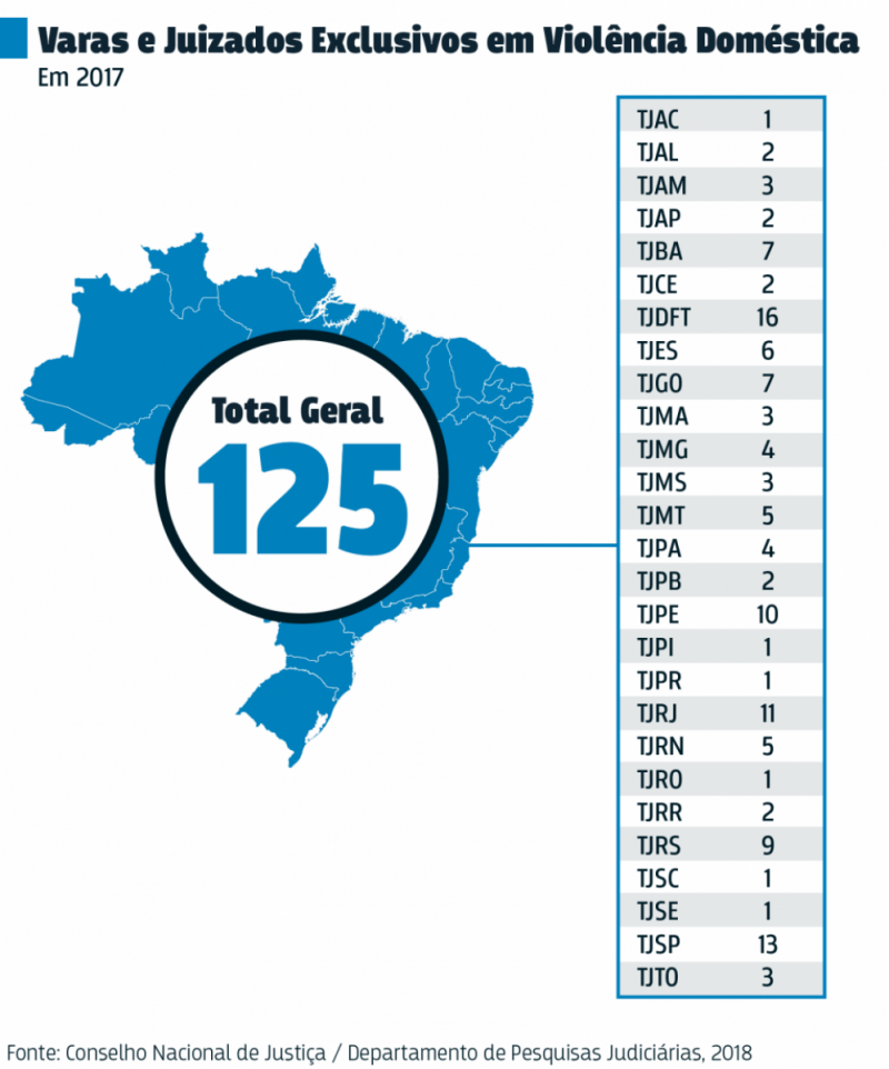 No ano passado, uma importante meta foi atingida pelo poder judiciário brasileiro: todos os tribunais de Justiça passaram a contar com, ao menos, uma Vara exclusiva para julgamento de crimes contra a mulher. Hoje, em todo o Brasil, o número total é de 125 unidades.