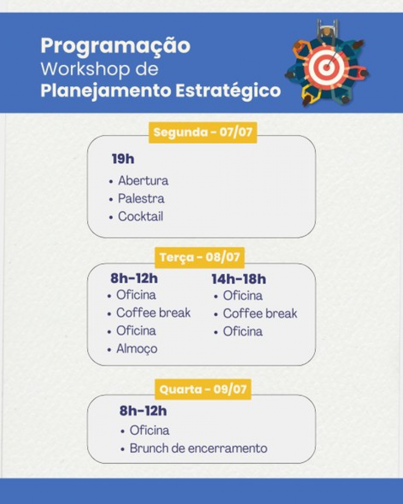 O Tribunal Regional Eleitoral da Paraíba (TRE-PB) realiza, a partir deste dia 7 de julho, o 1º Workshop de Revisão e Elaboração da Estratégia de Gestão. O evento reunirá 200 participantes da Justiça Eleitoral paraibana no Centro de Convenções da Paraíba, em João Pessoa, e marcará o início dos trabalhos para construção do novo planejamento estratégico do TRE-PB para os próximos seis anos.